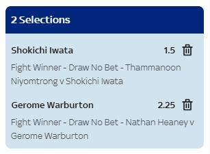 With the latest prices available at time of update [26-Feb-2026], Shockichi Iwata at the decimal odds of 1.5 (against Thammanoon Niyomtrong) looks like a strong favourite (15-Mar) and Gerome Warburton at the bigger price of 2.25 also looks generous to score the upset over Nathan Heaney (28-Mar). These two selections will create decimal odds of 3.38 in a double.