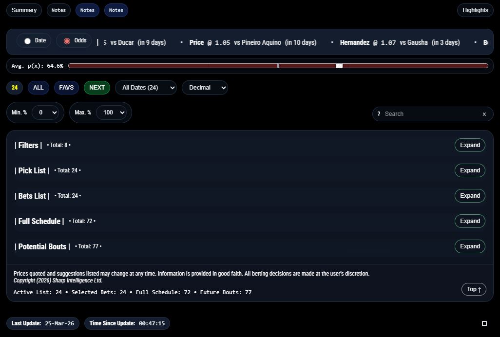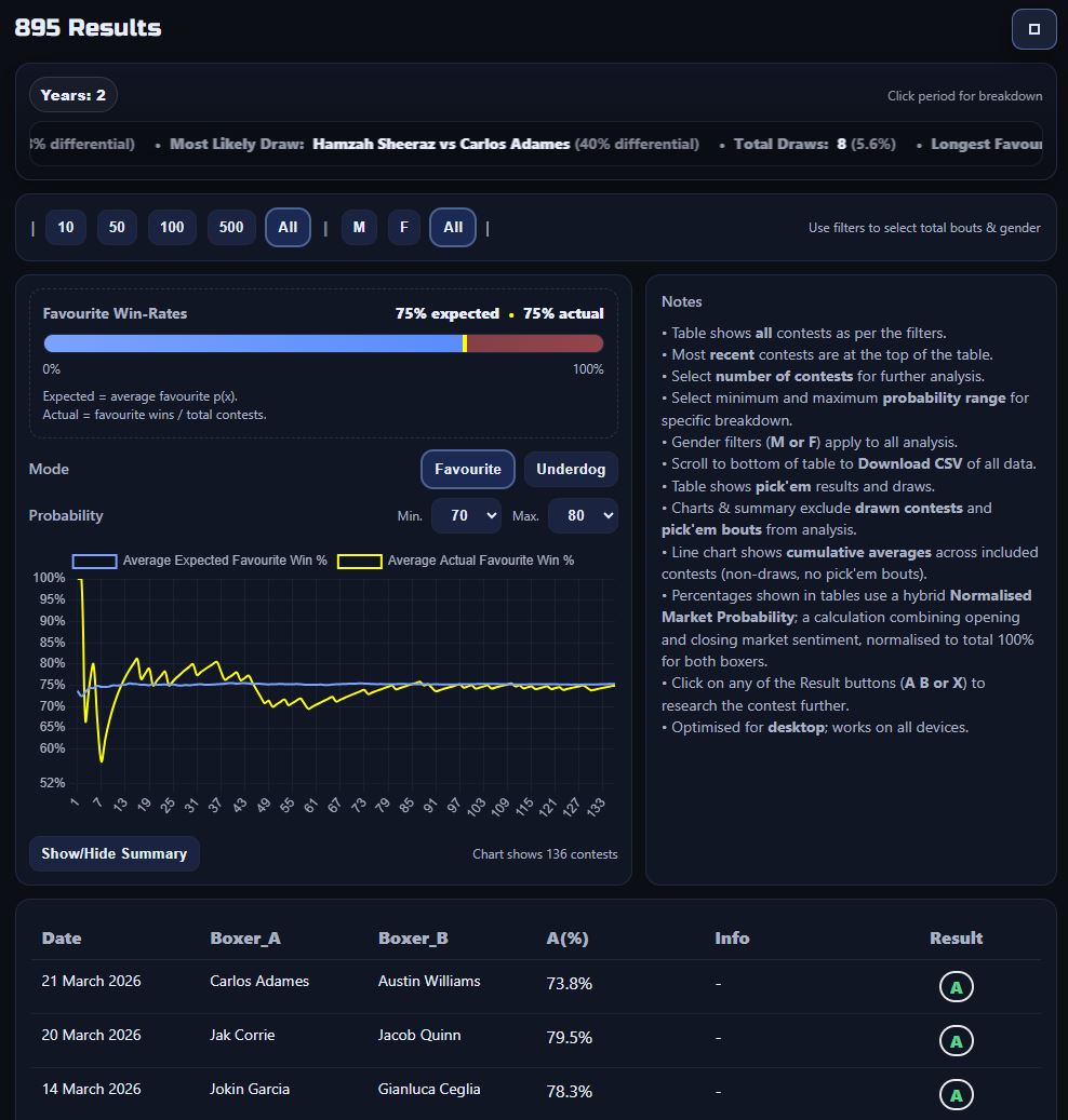 In the last dozen fights in The SharpBetting Boxing App, an underdog was picked at odds-against 3 times resulting in 3 upset wins (100% win-rate). The pick was odds-on 9 times with 8 wins (89% win-rate). Since the app went live on 12-Jan-2026 there have been 103 bets and a total profit of 23 units (22% ROI)