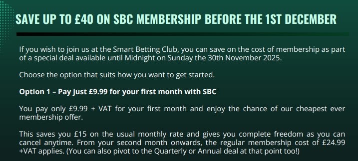 If you wish to join us at the Smart Betting Club, you can save on the cost of membership as part of a special deal available until Midnight on Sunday the 30th November 2025.