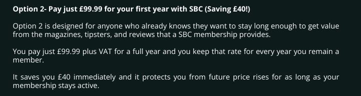Option 2 is designed for anyone who already knows they want to stay long enough to get value from the magazines, tipsters, and reviews that a SBC membership provides.